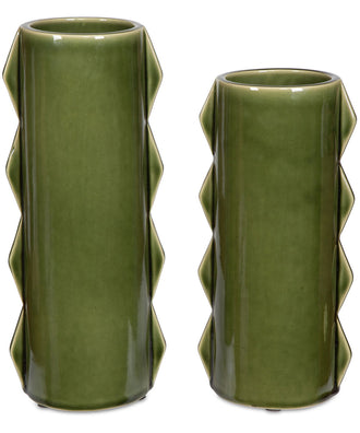 This dynamic set of two green ceramic vases showcases a distinctive zig-zag edge design that adds a modern touch to your decor. the rich green finish creates a bold statement, making them perfect for displaying fresh flowers or as stunning decorative accents. with their unique shape and vibrant color, these vases effortlessly elevate any space, whether on a dining table, shelf, or mantel. may be used outdoors, but protection from freezing temperatures is recommended. sizes: s-6x12x5, l-6x14x5