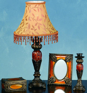 The 3"H Amherst 4 Piece Vanity Set is a stunning addition to any home, exuding elegance and sophistication. This set features a beautiful lamp with a saffron leaf-patterned fabric shade, edged with golden beads that add a touch of luxury. The antique bronze hand-finished oak leaves cradle fluted translucent amber accents, creating a timeless and classic look. The set also includes a jewelry box, candlestick, and frame with glass and mirror, which can be used as a picture or mirror frame, making it a versatile and functional ensemble.