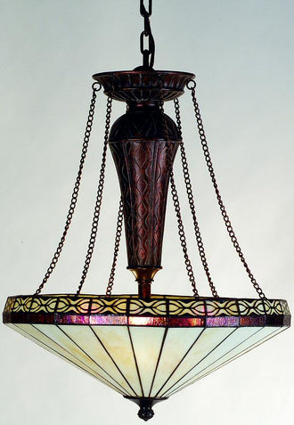 The 22"W Crestwood Inverted Pendant is a stunning piece that brings an air of sophistication and elegance to any room. This Meyda original features a beautifully simple beige paneled shade, which is accentuated by amethyst swirled granite glass. The delicate filigree on the beige glass adds a touch of intricate detail that enhances the overall aesthetic. The hand-painted Phoenician copper finish provides a rich, warm tone that complements the design perfectly.