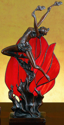 A scarlet stained art glass flame lights up the background of this accent lamp that features a torch wielding dancer jumping above the fiery flames. The lamp is hand finished in mahogany bronze.