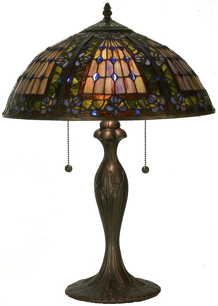 The shade of the lamp showcases a harmonious blend of rich colors, including shades of blue, green, and amber, which are meticulously arranged to form a striking fleur-de-lis motif. Each piece of glass is hand-cut and carefully assembled, ensuring that every lamp is a unique work of art. The natural variations in the glass add to the charm and character of the lamp, making it a true collector's item.