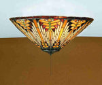 Warm earth toned Bone Beige and Moccasin Tan stained glass, accented with glistening Root Brown and Sage Green, is used to make this intricate interlocking patterned shade. Mission style hardware in a hand applied Mahogany Bronze finish supports the handsome round cone shade inspired by Native American artwork. Handcrafted with the copper foil technique developed by Louis Comfort Tiffany, this flush mount fixture is a true masterpiece.