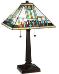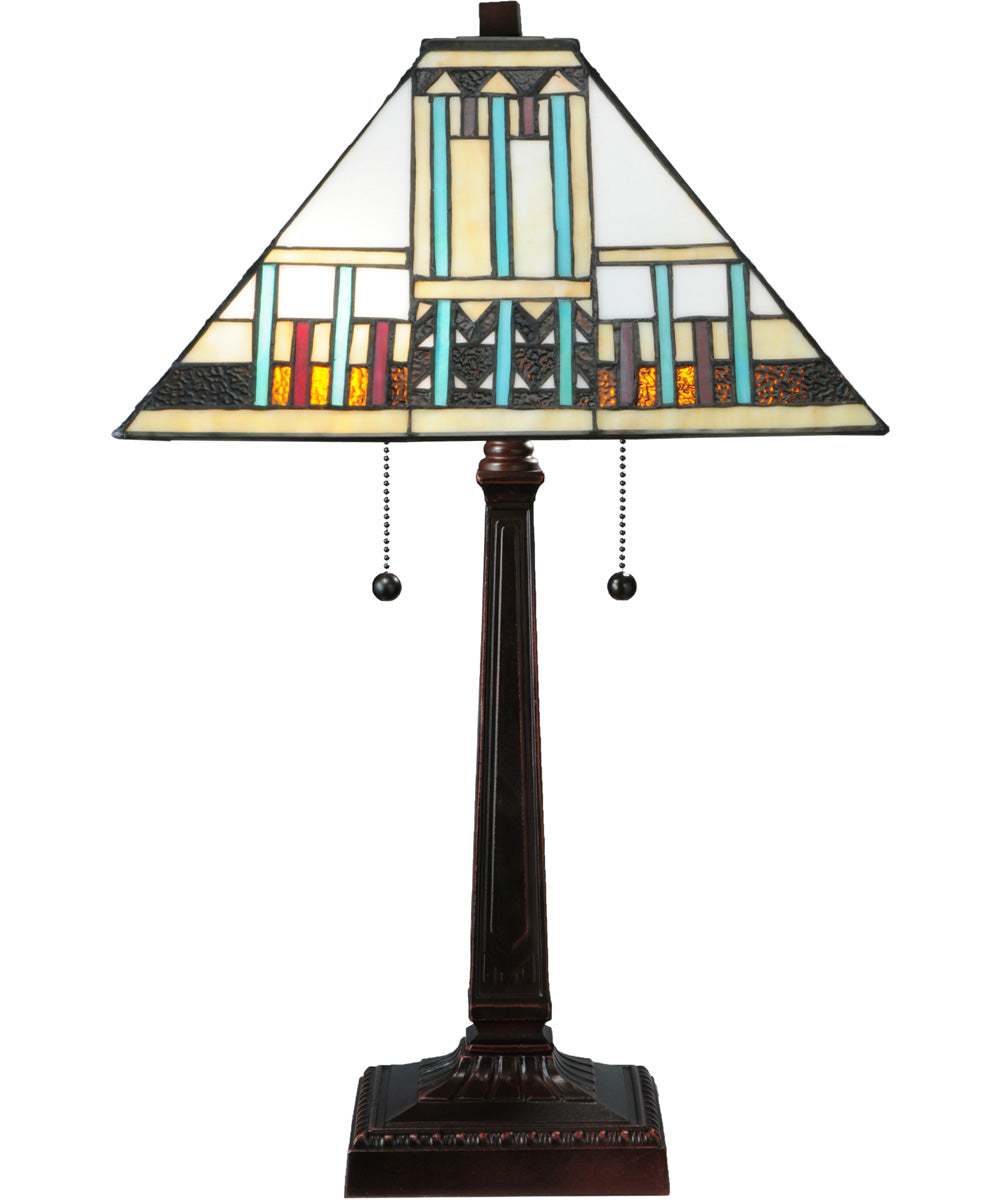 Introducing the 23"H Prairie Peaks 2-Light Tiffany Table Lamp by Meyda Tiffany, a true masterpiece that infuses traditional charm with a touch of modern elegance. This stunning table lamp is part of the renowned Prairie Peaks collection and features an intricate design that epitomizes timeless beauty. The lamp's shade showcases a harmonious blend of geometric patterns and vibrant colors, creating a captivating visual appeal that will elevate any room's decor.