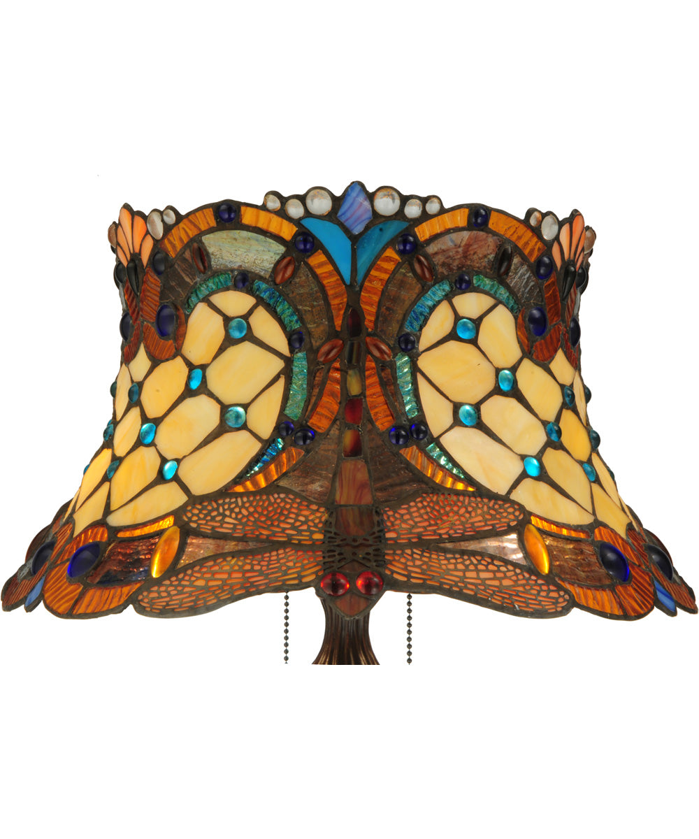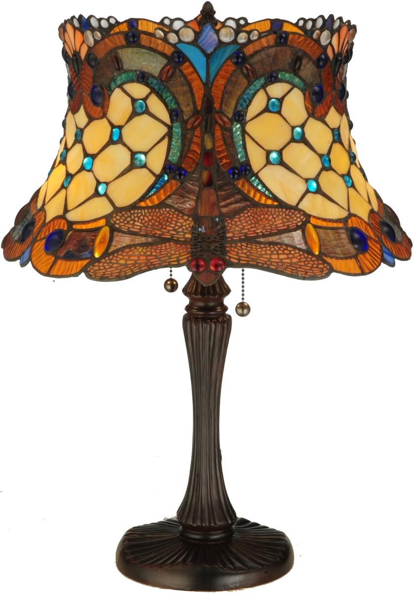 Imagine this delightful Table Lamp by Meyda Tiffany adding a wonderful new touch to your Traditional, Tiffany-styled room. The 23-inch high Hanging-head Dragonfly 2-Light Tiffany Table Lamp is a true masterpiece that combines exquisite design with practical functionality. The lamp features a beautifully intricate dragonfly design on the shade, showcasing a blend of warm, earthy tones and vibrant accents that create a stunning visual appeal. The brown finish of the lamp base complements the colorful stained glass shade, making it a perfect addition to any room with a classic or vintage decor.
