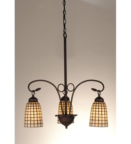 The chandelier features an intricate design with three beautifully crafted shades, each measuring 24.5 inches in height and 22 inches in width. The shades are adorned with a beige antique finish that exudes a warm and inviting glow. The delicate grid pattern on the glass adds a touch of sophistication and charm, making it a perfect addition to any room.