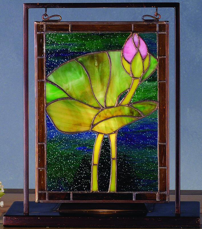 A single pink lily bud against a pond green lily pad floats on tranquil azure waters. This mini window, handcrafted of stained art glass and utilizing the copper foil construction process is encased in a solid brass frame and hangs perfectly in it's own brass tabletop display.