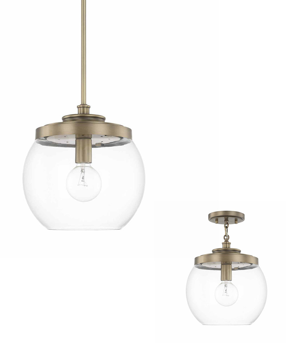 Our Mid-Century 1-light pendant brings definition and personality to any space. A row of these pendants would be perfect over a breakfast bar or kitchen island, or a pair of them could be used to elevate bedside lighting. Rounded clear, a warm Aged Brass finish and the option to semi-flush mount make this piece versatile. Also available in Polished Nickel, these pendants are perfect for introducing a mixed metal design scheme.