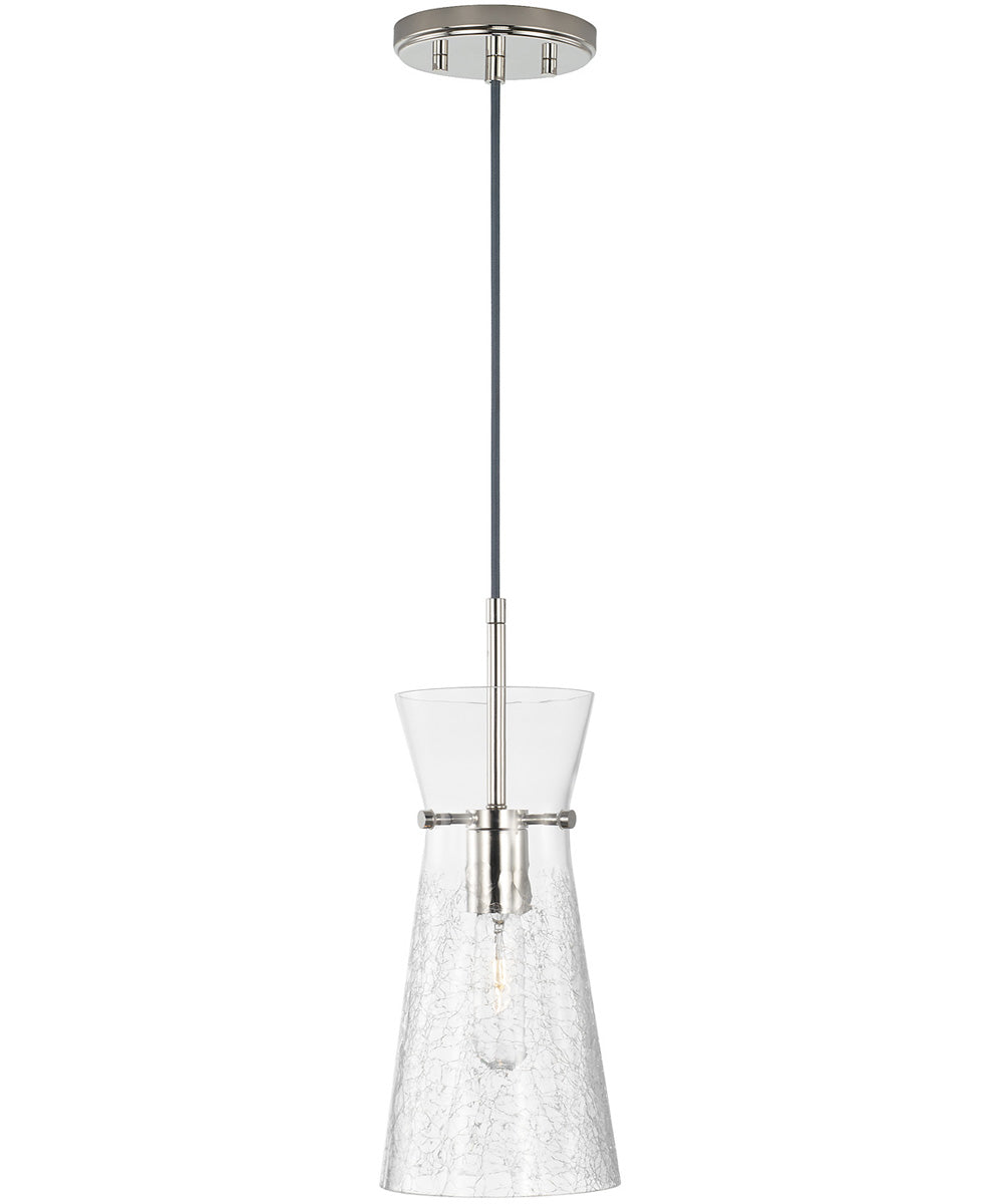 The Mila 1-Light Pendant in Polished Nickel is a stunning addition to any space, blending modern aesthetics with timeless elegance. The pendant features a unique half-crackle detail that adds a visual texture, beautifully complementing its tapered silhouette. The polished nickel finish enhances its sophisticated appeal, making it a versatile piece that fits seamlessly into various interior styles.