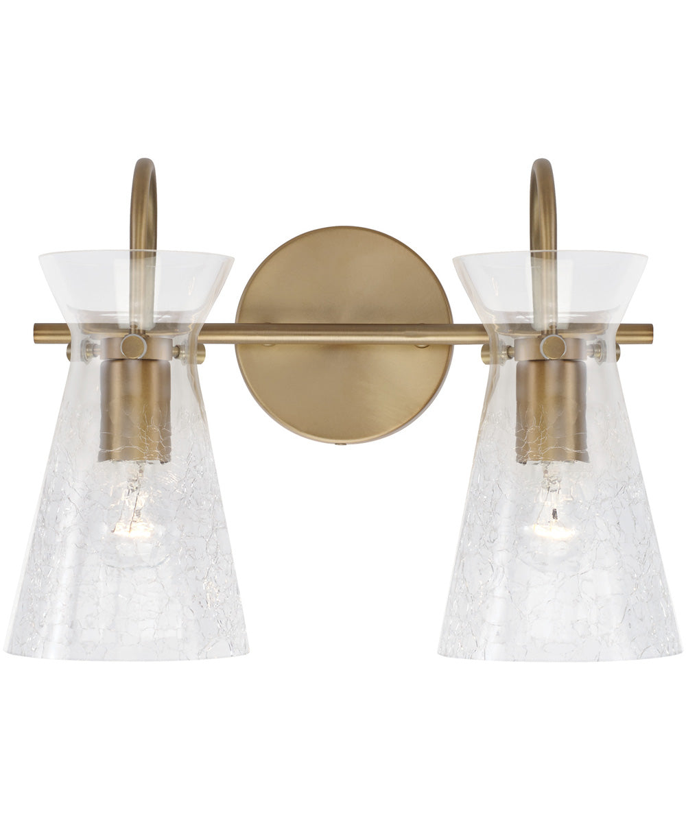 The unique half-crackle glass detail of the Mila 2-Light Vanity creates a one-of-a-kind visual texture. The Aged Brass finish and the tapered silhouette brings a sleek, sophisticated style. Also available in a 3-Light.