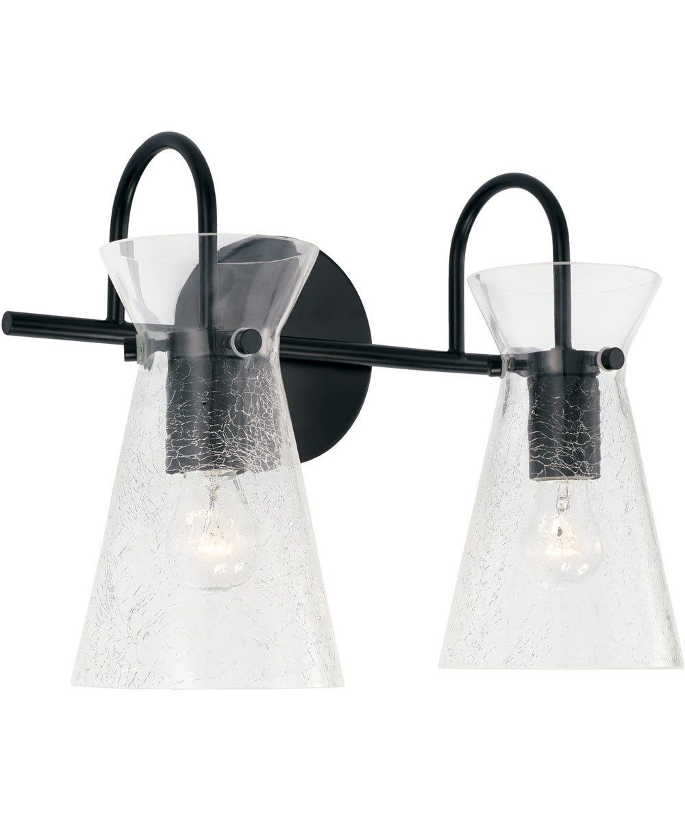 The unique half-crackle glass detail of the Mila 2-Light Vanity creates a one-of-a-kind visual texture. The Matte Black Finish and the tapered silhouette brings a sleek, sophisticated style. Also available in a 3-Light.