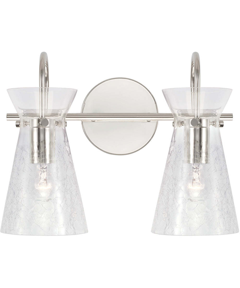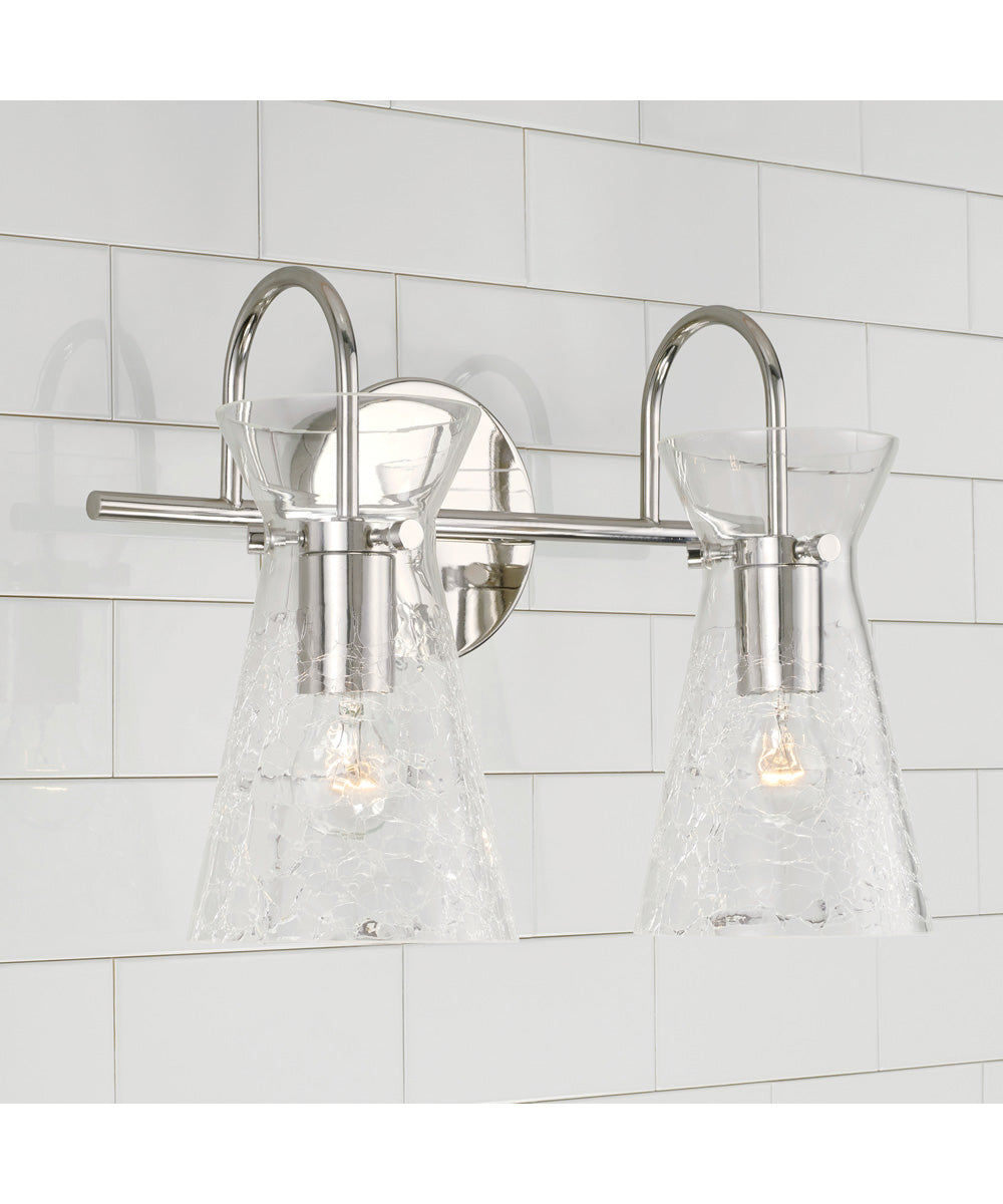 The unique half-crackle glass detail of the Mila 2-Light Vanity creates a one-of-a-kind visual texture. The Polished Nickel finish and the tapered silhouette brings a sleek, sophisticated style. Also available in a 3-Light.