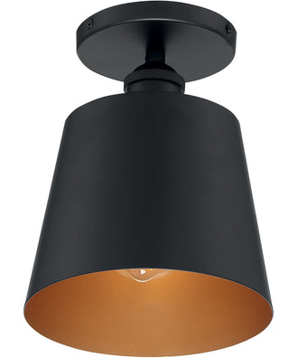 Introducing the Nuvo Lighting Motif 1-Light Close-to-Ceiling fixture, a perfect blend of elegance and functionality. This semi-flush mount light features a sleek black finish with sophisticated gold accents, creating a striking contrast that adds a touch of luxury to any space. The cone-shaped steel design is both modern and timeless, making it an ideal addition to contemporary and classic interiors alike.