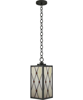 A contemporary classic, our Ory Outdoor Mini Pendant will add instant appeal to any outdoor area. The rectangular shade is crafted of large panels of frosted art glass that are encased in a metal frame. Each of the 4 sides feature a crisscross pattern that is accented with burnished amber art glass gems at each intersection that add a pop of color when the pendant is illuminated. Ory hangs from a round metal ceiling canopy and chain. All the metalwork is finished in contemporary Oil Rubbed Bronze, which complements any exterior decor. A wonderful choice for covered porches and patios, our Ory Outdoor Mini Pendant also is a delightful way to add cozy ambience to any outdoor seating area.