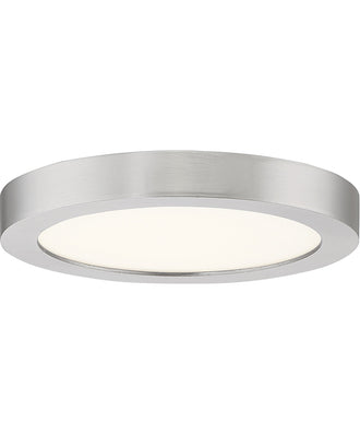 Available in four finishes and four sizes, the Outskirts flush mount is suited for a variety of room applications. In your choice of Earth Black, Brushed Nickel, White or Oil-rubbed Bronze, it is featured in sizes of 7.5”, 11”, 15”, or 20". The white acrylic shade is illuminated with integrated LED technology and the thick canopy adds depth to the simple structure.