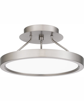 Outskirts is as stylish as it is functional. The contemporary semi-flush mount light is available in a variety of sizes, and in either a brushed nickel or matte black finish. An integrated LED light source shines through a round white acrylic shade, giving off the perfect amount of light for any indoor setting.