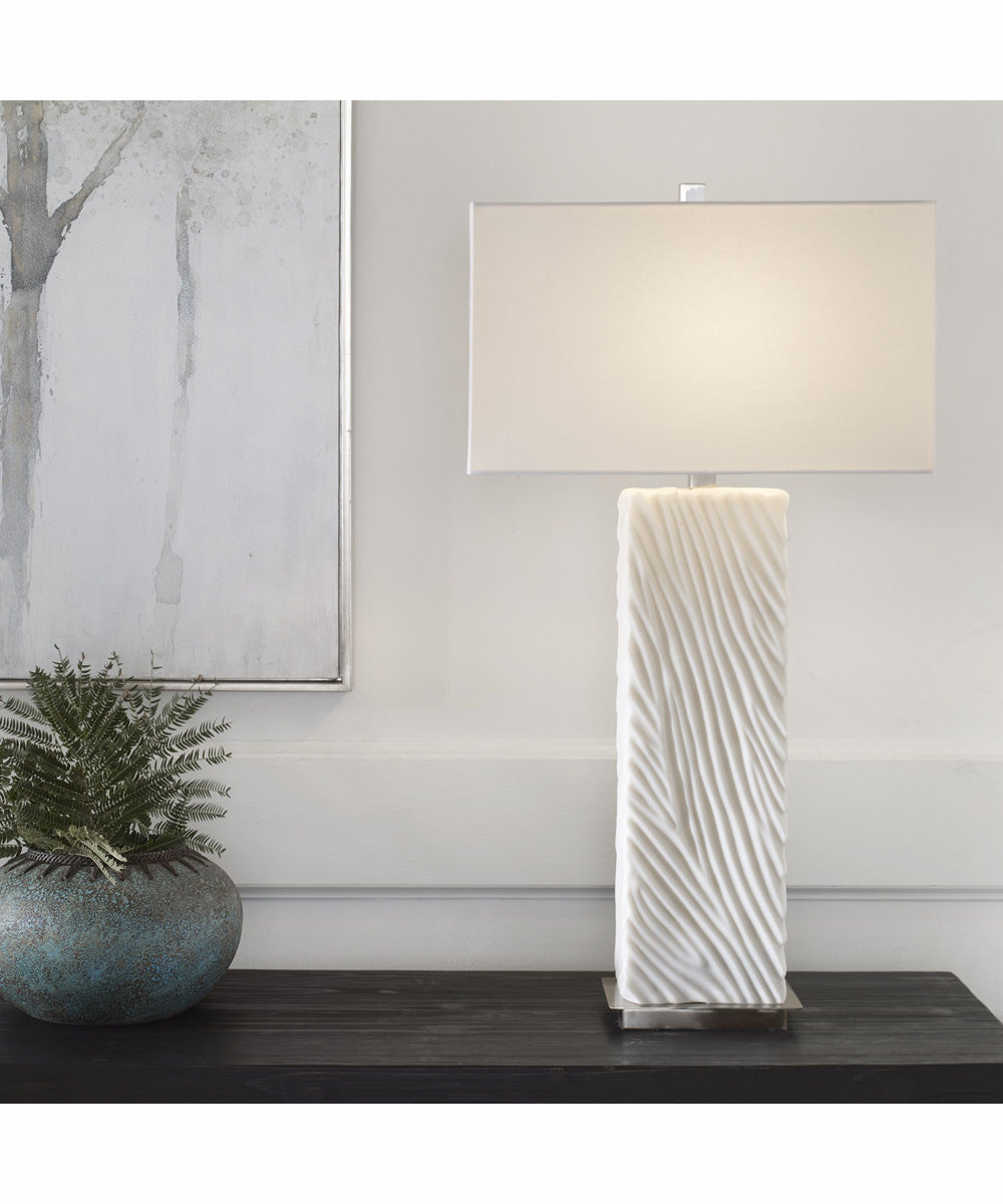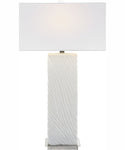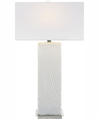The Pillar White Marble Table Lamp is a stunning addition to any home, embodying both elegance and sophistication. This lamp features a rich carved ivory man-made stone base that accurately replicates the luxurious look of Thassos marble. The intricate texture on the base adds a touch of artistry, making it a standout piece in any room. Complemented by brushed nickel finished iron details, this lamp exudes a modern yet timeless appeal.