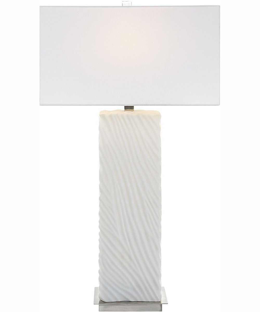 This table lamp is not only a visual delight but also highly functional. It includes a rectangular hardback shade made of white linen, which provides a soft, diffused light perfect for creating a warm and inviting ambiance. The shade measures 17 inches in width and 10 inches in depth, offering ample light coverage. Standing at 32 inches tall, this lamp is ideal for use on side tables, desks, or bedside tables, adding both illumination and style to your space.
