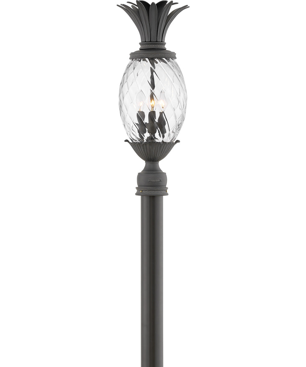 The Plantation 3-Light Medium Outdoor Post Top or Pier Mount Lantern in Museum Black by Hinkley is a stunning addition to any outdoor space. Its elegant design features a unique pineapple shape, symbolizing hospitality and warmth. The intricate detailing of the aluminum frame, finished in a sophisticated Museum Black, adds a touch of timeless charm to your exterior decor.