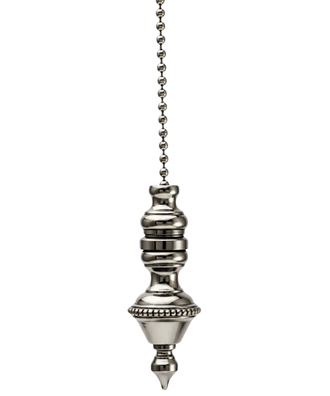 A new ceiling fan pull is the perfect way to complete your new or favorite fan. This quality hardware accent is sure to dress up your tired fan. Polished nickel beaded metal ball chain snaps into your existing chain connector on your fan. 95% of all lamp ceiling fans will fit this pull chain. Chain measures 12" length (and can be cut shorter), Beaded Spire Knob is 1.5" height and 1.25" width. Material: Metal with Polished Nickel Finish with matching Chain.