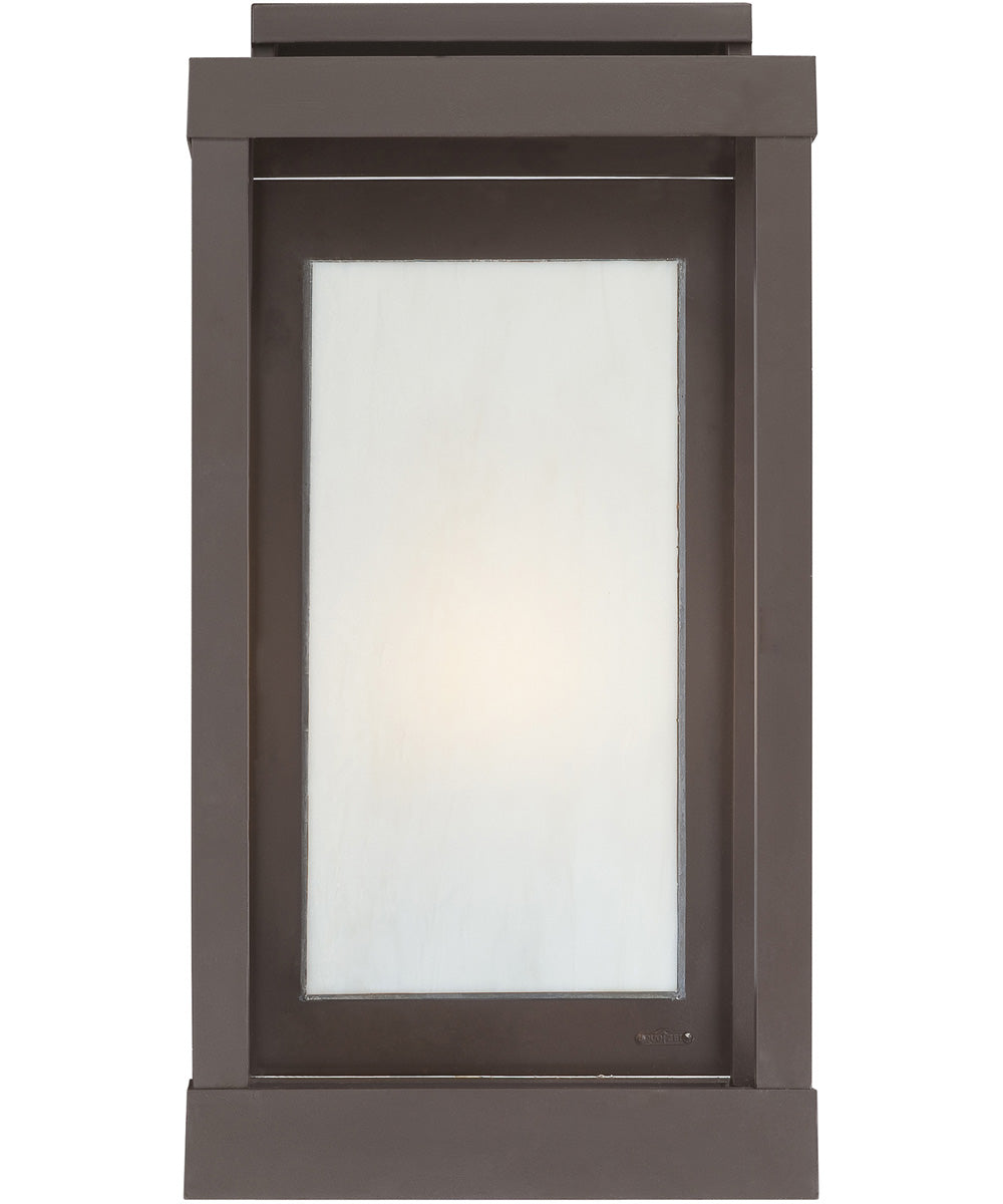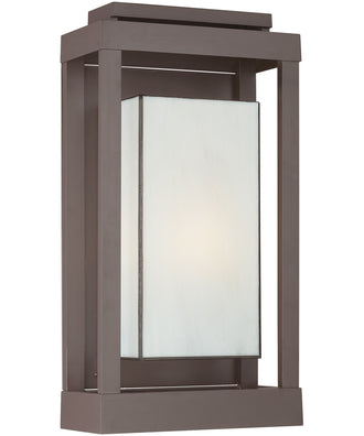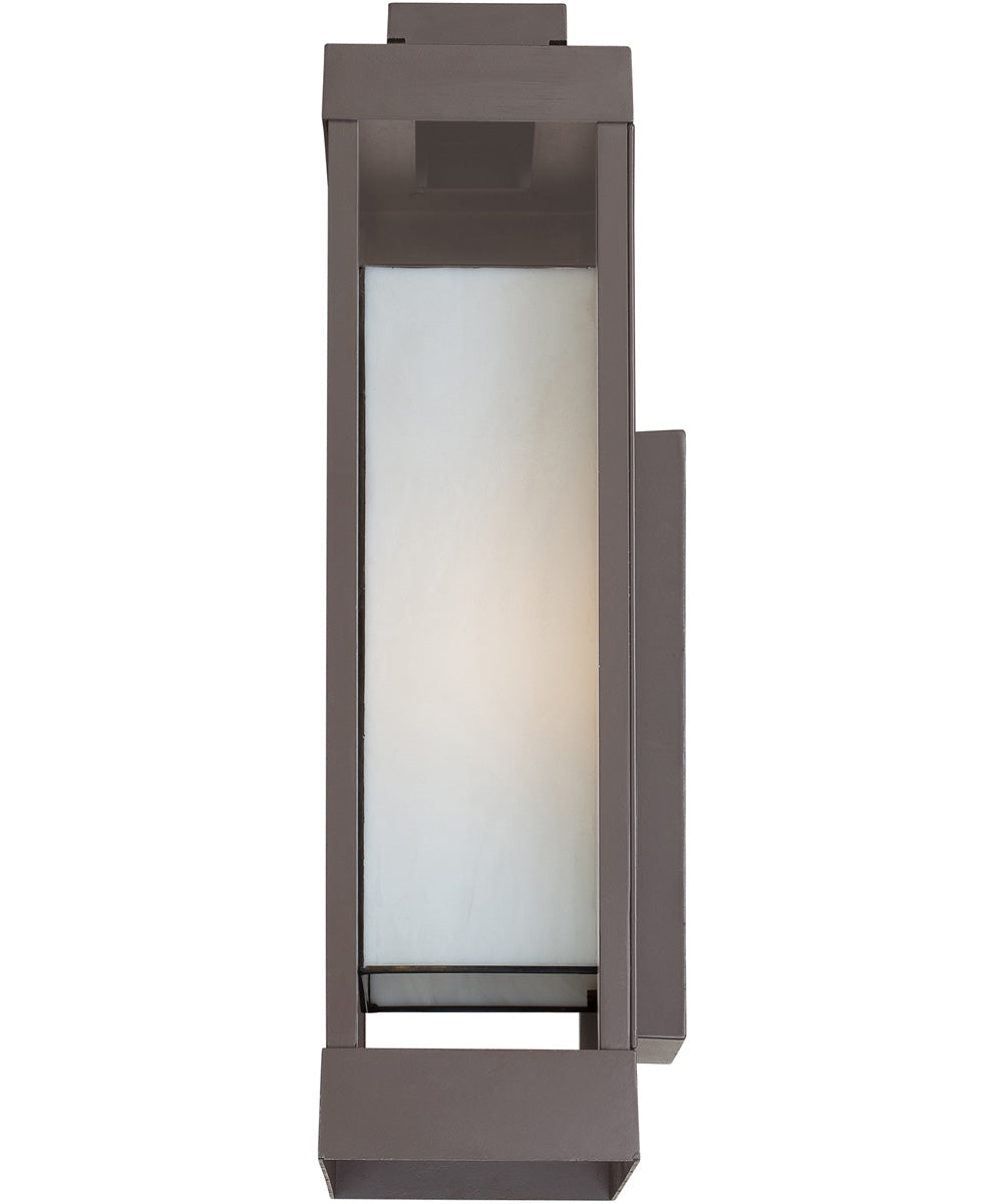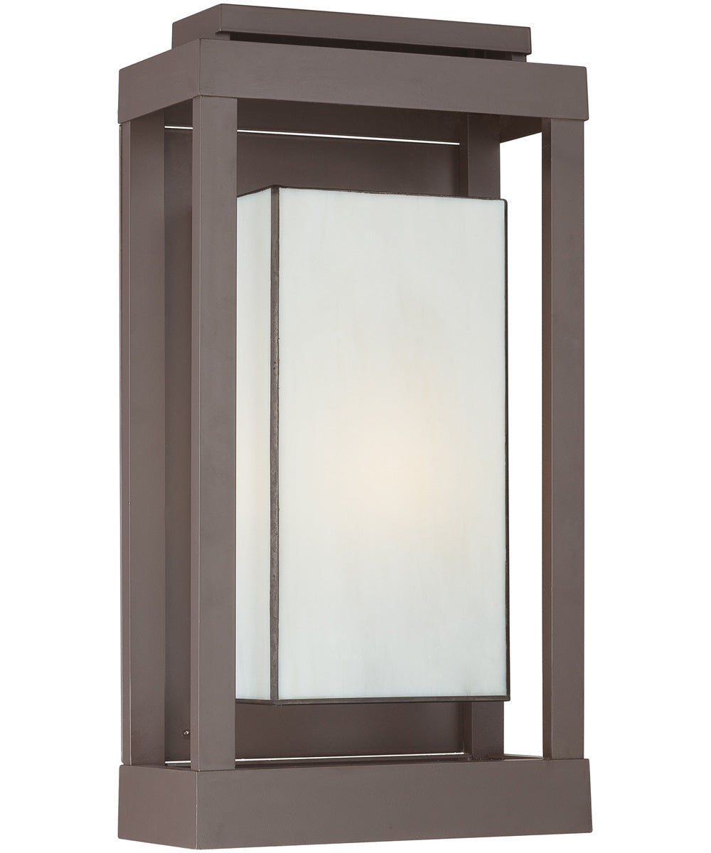 Enhance the exterior of your home with this unique and unadorned Powell collection. The shadowbox is striking in a western bronze finish and is contrasted beautifully by the rectangular white art glass.