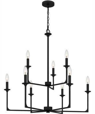 The Prescott 9-light Chandelier in Matte Black is a stunning addition to any home, offering eye-catching, transitional styling that seamlessly blends with various decor themes. The chandelier features a simple silhouette with sleek candle sleeves, creating an understated yet sophisticated look. Its matte black finish adds a modern touch, making it a versatile piece that complements both contemporary and traditional interiors.