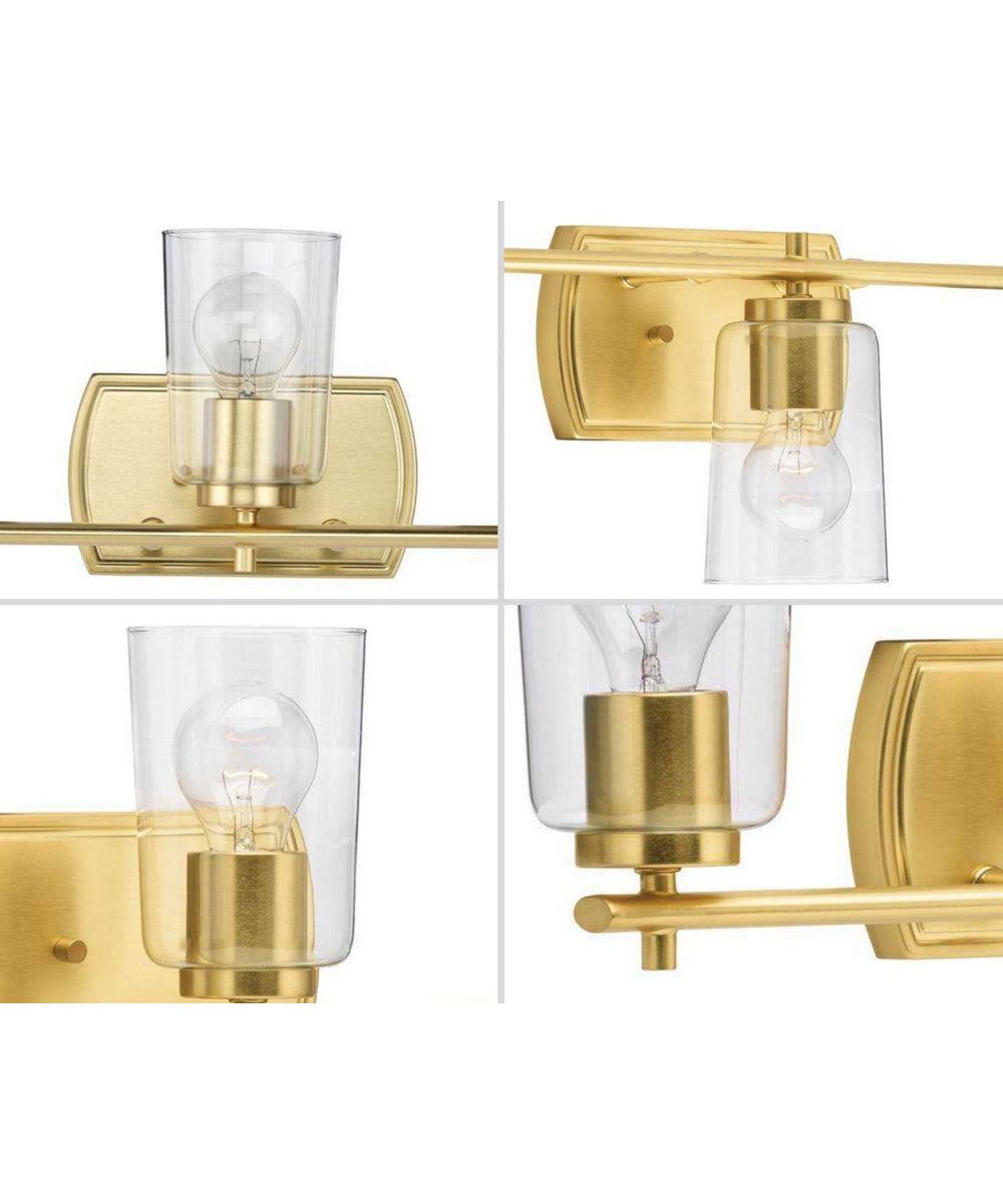 Ideal for a bathroom. Perfect for new traditional, traditional, and transitional style settings. Golden satin brass finish. Crisp clear glass shades. Mount the light fixture facing up or down. Use 3 medium base bulbs that are sold separately (60 W max - LED/CFL/incandescent). compatible with dimmable bulbs. Measures 23-inch width by 7.625-inch height by 6-inch (extends from wall). Certifications: UL/CUL Damp Location Listed. Pairs with a variety of lighting fixtures by Progress Lighting. Our 1-year Limited Warranty guarantees your complete satisfaction with your purchase and includes professional after-sales customer service support.
