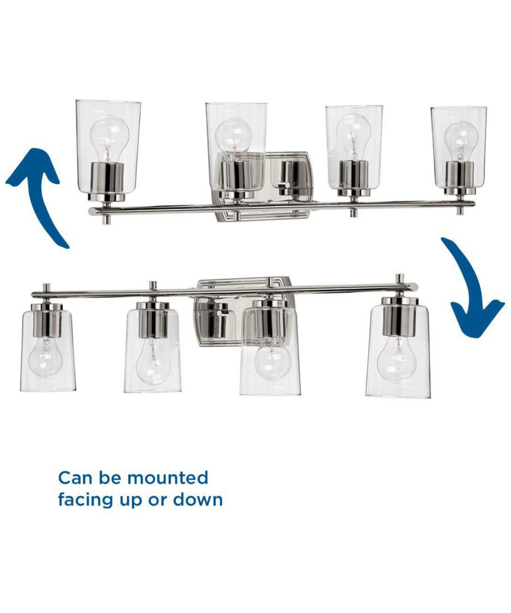 Ideal for a bathroom. Perfect for new traditional, traditional, and transitional style settings. Subtle polished nickel finish. Crisp clear glass shades. Mount the light fixture facing up or down. Use 4 medium base bulbs that are sold separately (60 W max - LED/CFL/incandescent). compatible with dimmable bulbs. Measures 32-inch width by 7.625-inch height by 6-inch (extends from wall). Certifications: UL/CUL Damp Location Listed. Pairs with a variety of lighting fixtures by Progress Lighting. Our 1-year Limited Warranty guarantees your complete satisfaction with your purchase and includes professional after-sales customer service support.