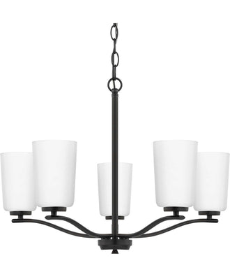 The Adley Collection chandelier is a simple, elegant fixture that is perfect over dining rooms, halls and home theaters or bedrooms. The light's form is fundamentally modern but with a traditional twist, making it ideal for transitional and contemporary interiors. The chandelier is coated in a stately matte black finish. The clean design combines etched white glass shades with a curved arms and simple, straight bars. Uses (5) 60-Watt maximum, medium base bulbs or LED equivalent, that is sold separately, and dimmable when used in conjunction with a dimmable bulb. Measures 22.87-in. diameter by 17.25-in. height. Includes 48 in. of chain for a variety of ceiling heights and can be used on a sloped ceiling. Warranty: Our 1-Year Limited Warranty guarantees your complete satisfaction with your purchase and includes professional after-sales customer service support. Includes installation instructions and mounting hardware for a quick, easy installation. Progress Lighting products are designed for exceptional quality, reliability, and functionality