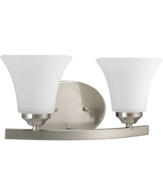 Ideal for a bathroom and powder room. Perfect for traditional and transitional style settings. Beautiful brushed nickel finish. Elegant etched glass shades. Mount the light fixture facing up or down. Use 2 medium base bulbs that are sold separately (100 W max - LED/CFL/incandescent). compatible with dimmable bulbs. Measures 13.25-inch width by 6.625-inch height by 6.25-inch (extends from wall). Certifications: UL-CUL Damp Location Listed. Pairs with Joy, Bravo and Trinity collections by Progress Lighting. Our 1-year Limited Warranty guarantees your complete satisfaction with your purchase and includes professional after-sales customer service support.