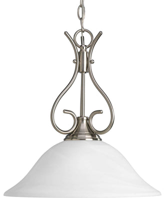 One-light pendant. Brushed Nickel finish. Alabaster style glass. Delicate scroll details. Requires one (1) 100-watt bulbs (not included). Includes 3' of chain, 120 inches of wire. UL Listed.