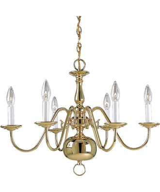 Six-light chandelier in the timeless Americana collection with delicate arms, decorative center column and candelabra lamps. Polished Brass finish.