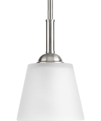 The Arden 1-Light Etched Glass Farmhouse Mini-Pendant Light in Brushed Nickel is a beautiful blend of rustic charm and modern elegance. Its sleek, contemporary design features a substantial stem that suspends a delicately etched glass shade. The brushed nickel finish adds a touch of sophistication, making it a versatile choice for various interior styles, from farmhouse to transitional.