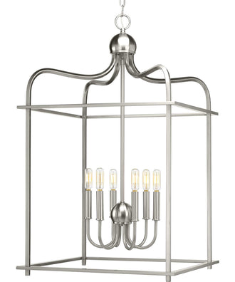 Assembly Hall provides a formal and classic open caged pendant for a variety of traditional and transitional interiors. This Design Series collection features arching frames that are great in scale and surround a candelabra cluster with matching candles. Six-Light Brushed Nickel Foyer Pendant.