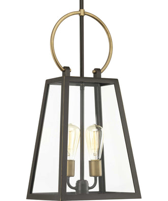 Barnett lanterns deliver timeless appeal with a decidedly modern flair. Features dramatic overscaled loop in a contrasting brass-tone finish. Antique Bronze finish. Large clear panes of glass frame your choice of traditional or vintage style bulbs. Hanging lantern uses two 60-watt max. medium base bulbs (sold separately). Perfect showcase for vintage style light bulbs, including Progress Lighting's P7825-01 or P7827-01. Outdoor lanterns add illumination to walkways and pathways to enhance safety and security. Suitable for a variety of exteriors.