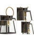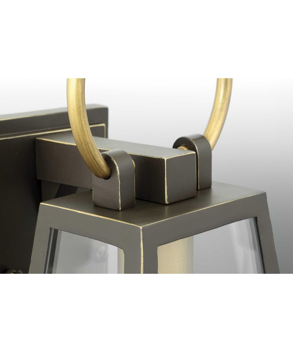Barnett lanterns deliver timeless appeal with a decidedly modern flair. Features dramatic overscaled loop in a contrasting brass-tone finish. Antique Bronze finish. Large clear panes of glass frame your choice of traditional or vintage style bulbs. Wall lantern uses one 100-watt max. medium base bulbs (sold separately). Perfect showcase for vintage style light bulbs, including Progress Lighting's P7825-01 or P7827-01. Outdoor lanterns add illumination to walkways and pathways to enhance safety and security. Suitable for a variety of exteriors.