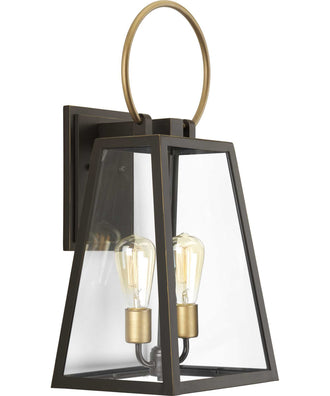 Barnett lanterns deliver timeless appeal with a decidedly modern flair. Features dramatic overscaled loop in a contrasting brass-tone finish. Antique Bronze finish. Large clear panes of glass frame your choice of traditional or vintage style bulbs. Wall lantern uses two 60-watt max. medium base bulbs (sold separately). Perfect showcase for vintage style light bulbs, including Progress Lighting's P7825-01 or P7827-01. Outdoor lanterns add illumination to walkways and pathways to enhance safety and security. Suitable for a variety of exteriors.