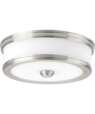 Features a sleek and slim appearance inspired by architectural design. One light LED flush mount. Popular Brushed Nickel finish. Etched white glass is accented by a metal trim in a metallic finish. Features 17-watt integrated LED to deliver energy savings and reduce long-term maintenance costs. The glass shade is illuminated on both the bottom and sides to provide a pleasing lighted effect. 1276 lumens, 73 lumens per watt (source). 3000K color temperature, 90CRI. ENERGY STAR certified. California JA8 certified.