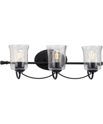 Ideal for a bathroom. Perfect for coastal, farmhouse, rustic, and transitional style settings. Classic matte black finish. Elegant clear chiseled glass shades. Mount the light fixture facing up or down. Use 3 medium base bulbs that are sold separately (60 W max - LED/CFL/incandescent). compatible with dimmable bulbs. Measures 25-inch width by 7.75-inch height by 7.375-inch (extends from wall). Certifications: cULus Damp Location Listed. Pairs with the Whisp and Bonn collections by Progress Lighting. Our 1-year Limited Warranty guarantees your complete satisfaction with your purchase and includes professional after-sales customer service support.