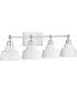 Ideal for a bathroom. Perfect for coastal, farmhouse, and urban industrial style settings. Gloss white with crisp polished chrome accents. Metal reflector-style shades. Mount the light fixture facing up or down. Use 4 medium base bulbs that are sold separately (100 W max - LED/CFL/incandescent). compatible with dimmable bulbs. Measures 33.375-inch width by 8.25-inch height by 7.125-inch (extends from wall). Certifications: cULus Damp Location Listed. Pairs with a variety of lighting fixtures by Progress Lighting. Our 1-year Limited Warranty guarantees your complete satisfaction with your purchase and includes professional after-sales customer service support.