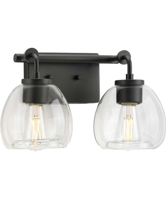 Ideal for a bathroom or powder room. Perfect for urban industrial, farmhouse, and rustic style settings. Gorgeous graphite finish. Bell-shaped clear glass. Mount the light fixture facing up or down. Uses 2 medium base base bulbs that are sold separately (60 W max - LED/CFL/incandescent). Measures 8-87/100-inch height by 14-31/50 length by 7-1/2-inch width (extends from wall). Certifications: cULus Damp Location Listed. Pairs with the Cirro and Zin collections by Progress Lighting. Our 1-year Limited Warranty guarantees your complete satisfaction with your purchase and includes professional after-sales customer service