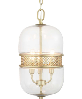 The Cayce 3-Light Pendant in Vintage Gold is a stunning addition to any home, offering a perfect blend of elegance and modern design. This pendant light features a unique capsule silhouette that showcases an interior candelabra cluster, creating a warm and inviting ambiance. The interlocking hexagonal design in the middle of the glass adds a touch of visual interest, making it a focal point in any room.