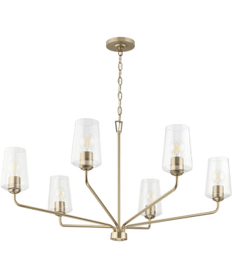 Illuminate your space with the refined elegance of the Celino 6-Light Large Chandelier in Champagne Bronze. This stunning chandelier features a sophisticated design inspired by the graceful silhouette of hand-crafted crystal wine glasses. Each of the six perfectly proportioned clear glass shades delivers bright, even light to your living area, creating a warm and inviting ambiance. The polished metal arms, finished in a rich Champagne Bronze, curve upwards to cradle the glass shades with a gentle embrace, adding a touch of timeless artistry to any room.