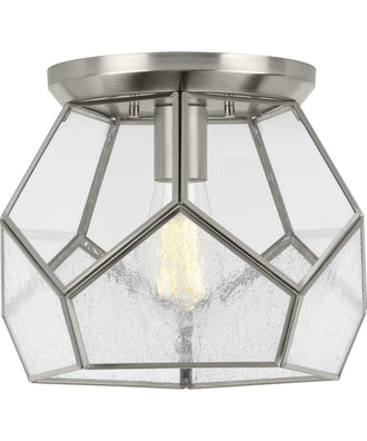 Glass panels create a shade that holds an industrial light base inside. Geometric shapes form from the brushed nickel frame. Inspired by modern geometric designs and contrasting elements, this bohemian-style flush mount is an attention-grabber for all the right reasons. Ideal for any hall, foyer, porch, patio, or kitchen. Perfect for urban industrial, farmhouse, or bohemian settings. Measures 12-inch width by 9-1/4-inch height. Uses one medium base bulb that is sold separately (100w max - LED or incandescent). Able to be fully dimmable with dimmable bulbs. Includes installation instructions and mounting hardware. Progress Lighting products are designed for exceptional quality, reliability, and functionality.