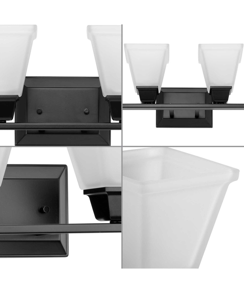Distinctive forms and clean lines create an enduring style perfect for bathrooms. Inspired by craftsman styling, the wall light has a substantial design ideal for modern farmhouse interiors. Elegant etched glass shades held by a chiseled frame provides a soothing, even light. Careful attention to the details delivers a dramatic accent to the craftsman-inspired frame. A classic matte black finish highlights the simple design of the light. Versatile: mount the light fixture up or down. Measures 31.875 in. length x 5.5 in., extends 8.375 in. Uses 4 100-Watt maximum medium base bulbs, or LED equivalent, that are sold separately. Fully dimmable when used with dimmable bulbs. Includes installation instructions and mounting hardware. Our 1-Year Limited Warranty guarantees your complete satisfaction with your purchase and includes professional after-sales customer service support