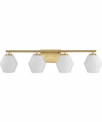 Add a touch of elegance to bathrooms and powder rooms with the Copeland Collection vanity light. The light's beautiful style is perfect for mid-century modern, transitional, and contemporary settings. The fixture is coated with a brushed gold finish, fitting beautifully into contemporary bathrooms. Soft geometrical diamond silhouette glass shades diffuses soft light from within adding a stately modern flair. Mount the light fixture with the glass facing up or down for more design flexibility. Measures 33 in. length by 7.5 in. height, extends 7 in. Uses (4) 75-Watt maximum medium base bulbs, or LED equivalent, that is sold separately and dimmable when used in conjunction with a dimmable bulb. Certifications: cULus Damp Location listed, fixture can be used in rooms such as bathrooms, powder rooms or covered outdoor rooms where moisture may be present. Warranty: Our 1-Year Limited Warranty guarantees your complete satisfaction with your purchase and includes professional after-sales customer service support. Includes installation instructions and mounting hardware for a quick, easy installation