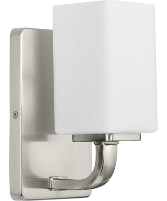 A contemporary urban aesthetic and warm ambient lighting create a relaxed atmosphere in bathrooms, bedrooms, hallways and foyers. An elegant combination of etched opal glass, brushed nickel finish and contemporary styling make this wall light ideal for modern, mid-century modern and traditional settings. A softly etched opal glass shade is mounted on a curved arms attached to a rectangular backplate creating sophisticated style. This wall sconce can be placed adjacent to vanity mirrors, along hallways, or on either side of a bed to fill the room with a soothing glow. A beautiful brushed nickel finish highlights the simple design of the light. Versatile: it can be mounted up or down. Measures 4.75 in. length x 8.5 in. height, extends 5.5 in. Uses 1 100-Watt maximum medium base bulbs, or LED equivalent, that are sold separately. Fully dimmable when used with dimmable bulbs. Includes installation instructions and mounting hardware. Our 1-Year Limited Warranty guarantees your complete satisfaction with your purchase and includes professional after-sales customer service support