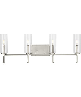 Elara features a slender, chic form with stylized finials that make it an elegant yet unobtrusive light for bathrooms. Its classically modern style is perfect for new traditional and transitional interiors. A beautiful brushed nickel finish enhances Elara's sophisticated design. The vanity light's finials have a slender, elongated shape inspired by a chess pawn. Clear cylindrical glass shades offer a modern appeal. A smooth, rectangular backplate anchors the slender bar and chess-inspired finials. Measures 31.65 in. length x 11.5 in. height, extends 5.12 in. Uses 4 60-Watt maximum candelabra base bulbs, or LED equivalent, that are sold separately. Fully dimmable when used with dimmable bulbs. Includes installation instructions and mounting hardware. Our 1-Year Limited Warranty guarantees your complete satisfaction with your purchase and includes professional after-sales customer service support