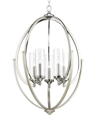 Evoke features an elliptical frame that gracefully supports a candelabra with clear glass shade. Mixed finished highlight the unique shape and provide a hint of livable luxury to your home. This five-light chandelier with Polished Chrome finish and Silver Ridge accents is part of our Design Series collections.
