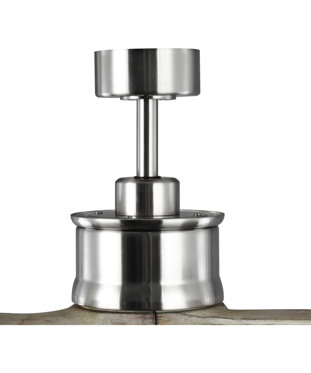 The fan blades are finished in gray weathered wood, adding a rustic charm that complements the brushed nickel finish of the motor housing. Constructed from durable steel, this ceiling fan promises longevity and reliability. The oversized, textured die-cast hanger ball reduces noise and wobble vibrations, ensuring smooth and stable operation.
