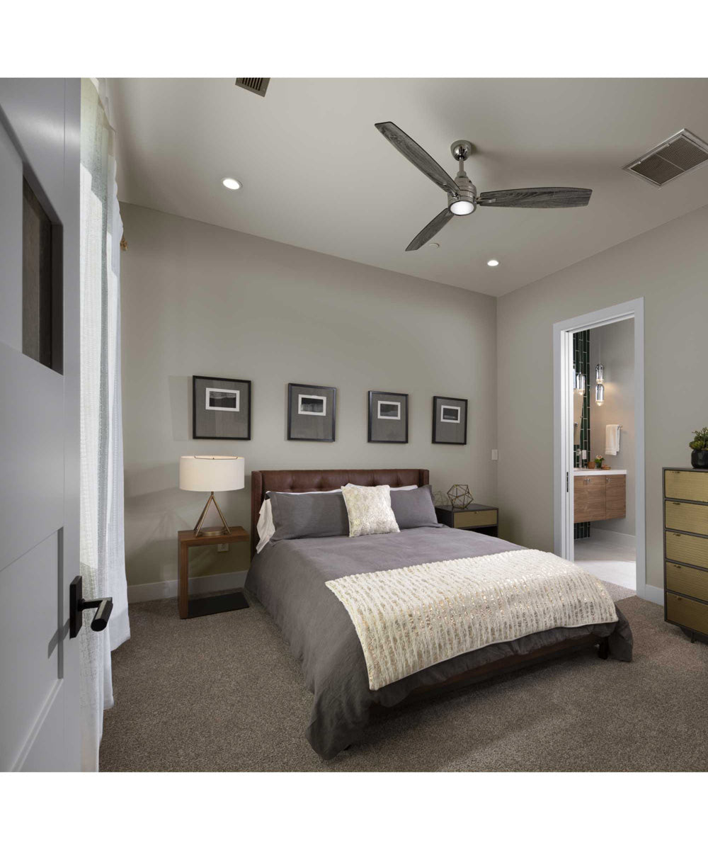 This ceiling fan comes with an integrated LED light kit, which is removable to offer the option for non-illuminated applications. The light kit includes a white opal polycarbonate shade and an 18W dimmable 3000K LED module, providing 1400 lumens with a high color rendering index (CRI) of 90+. This ensures that your room is well-lit with energy-efficient lighting that enhances the ambiance.